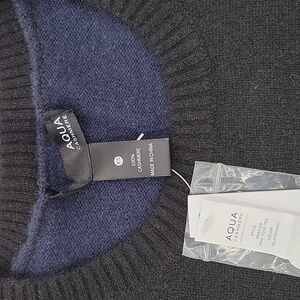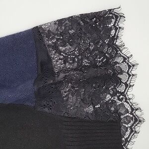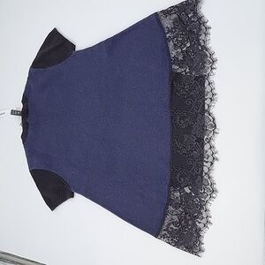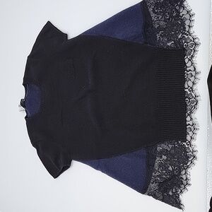 new with tags short sleeve cashmere sweater by Aqua. xsmall. 32" chest. A Line, lace cut outs at bottom sides. front and sleeves are black. back is navy blue (SH-043)