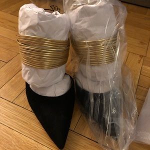 NWT! Aquazzura black suede sz 6, 4” pumps with gold straps
