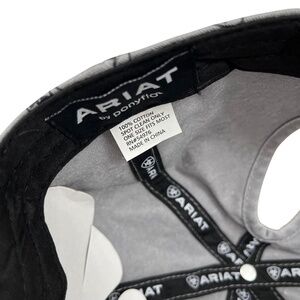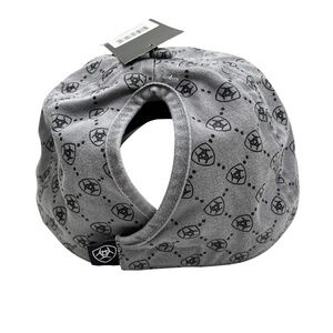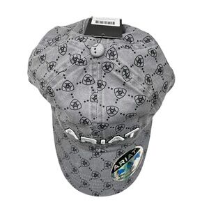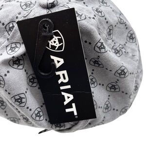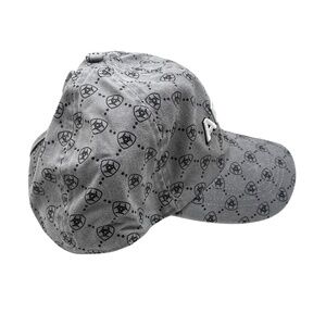 Ariat Ladies Ponyflo Cap. Style #A300064006. 100% cotton. Hook and loop closure with opening for ponytail. Gray with allover black Ariat shield logo print. 3D embroidered Ariat logo on front. Curved bill.