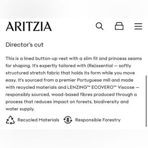 This is a lined button-up vest with a slim fit and princess seams for shaping. It's expertly tailored with (Re)ssential — softly structured stretch fabric that holds its form while you move easy. It's sourced from a premier Portuguese mill and made with recycled materials and LENZING™ ECOVERO™ Viscose — responsibly sourced, wood-based fibres produced through a process that reduces impact on forests, biodiversity and water supply.