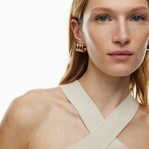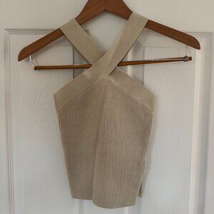 Beige, Tan, Ecru, Greige, Neutral, Express, Loft, Free People, Anthropologie, going out top, date night, office wear, work wear, chic, elegant, sexy, halter, sleeveless, tank, blouse, cross neck, formfitting, flattering, tight, sculpting, ribbed fabric, comfortable, textured, warm, summer, layers, basic, shell, new with tags, extra small, tank, luxe, dupe, Ann Taylor, Abercrombie, preppy, knit, soft, tailored