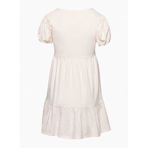 V is for volume. This is a V-neck babydoll dress with puff sleeves, an empire waist and a tiered skirt. It’s made with soft, combed 100% cotton jersey.