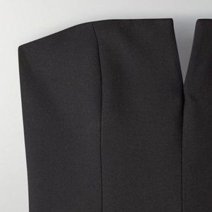 This is a strapless, wide-leg lumpsuit with a notched bodice and creased legs. The crepe suiting fabric is made with LENZING™ ECOVERO™ — a wood-based fibre produced through a more sustainable process.