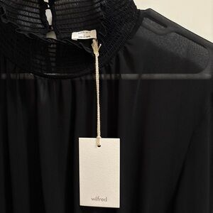 The NWT Aritzia Wilfred Turner Sheer Chiffon Maxi Dress is a striking piece that embodies a bohemian gothic style. This dress features a mock neck neckline, long sleeves, and a solid black color that exudes a sense of dark elegance. The sheer chiffon fabric adds a touch of femininity while the maxi length gives it a flowing and dramatic silhouette. Perfect for those who want to make a statement with their fashion choices, this dress is sure to turn heads wherever you go.