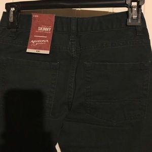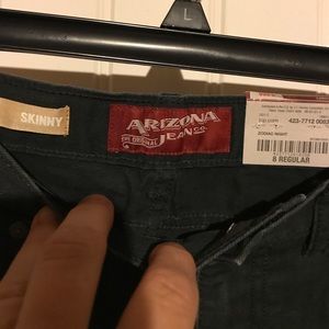 Jeans colored in between the two pictures with these new with tags Arizona Jean Co. black skinny jeans. Color on tag says Zodiac night. Size 8 Regular jeans have belt loops, 5 pockets, rivets and close with a button and zipper. Tag states Skinny. Sits low on waist. Extra slim fit. Skinny leg.