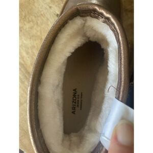 This is a new Arizona metallic bronze ankle bootie in women's size 6 It features memory foam for added comfort. With a synthetic upper material and faux fur insole, this boot is suitable for winter, fall, and spring seasons. The style is a trendy bootie with a metal theme, perfect for adding a stylish touch to any outfit.