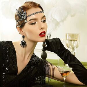 ✨ NWT Art Deco 1920’s Gatsby Flapper Crystal Rhinestone & Pearl, Black