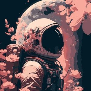 This stunning design features a serene astronaut surrounded by blooming cherry blossoms, set against a celestial backdrop with a glowing planet in the distance. The soft pink hues of the sakura flowers beautifully contrast with the dark, mysterious space theme, creating a captivating piece of art that feels feels both peaceful and adventurous.