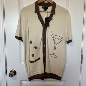The NWT Art of Rhetoric Martini Olive Button Up Knit Bowling Button Up Down Shirt Cardigan is a stylish and casual button up shirt perfect for men. Made from a blend of nylon, rayon, and cotton, thisgraphic print shirt features a collared neckline, short sleeves, and a spread collar style. The beige color and retro theme make it a great option for the summer, fall, and spring seasons. With lightweight breathable fabric and convenient pockets, this shirt offers both comfort and style for a variety of occasions.