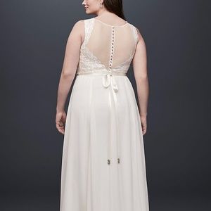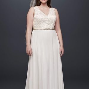 Perfect for any season but especially beautiful for a winter wedding. Brand new, unaltered David's Bridal wedding dress (Scalloped Lace Mermaid). This beautiful simple dress is art-deco style, with scalloped sequining on the bodice and a chiffon skirt. The bodice has a v-neck and a sheer back. The dress is ivory with a champagne underlay. There is an ivory ribbon that can be easily detached and replaced with a belt of your choice. The dress is a bridal size 22W but fits a street size 16.