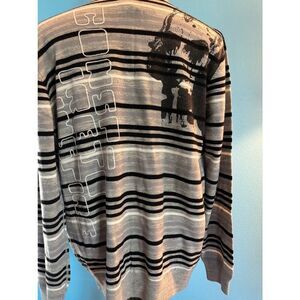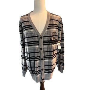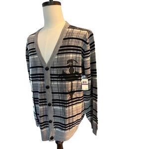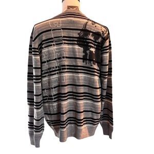 New With Tags, Artful Dodger Conspire Inspire Cardigan Sweater Intarsia Knit Graphics Design, 5 Signed Buttons Close, Retail $148