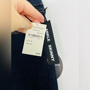 Stunning dark wash skinny jeans. Size 26. Waist about 13.75 inches laying flat. About 8.5 inch rise and 29.25 inch inseam. Brand new with tags.