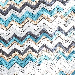 Glittering chevron stripes in beachy hued sequins add energy to this scooped-back three-quarter-sleeve minidress.