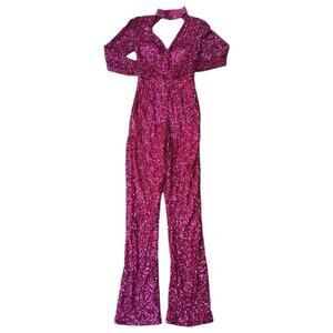 NWT Ashley Lauren V-Neck Open Back Choker Long Sleeve Sequin Fuchsia Jumpsuit 4