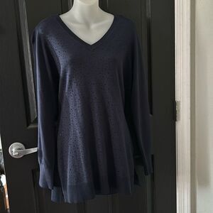 This soft knit sweater features a classic V-neck design in a rich, deep blue with scattered rhinestones for a subtle shimmer. Its relaxed tunic-length silhouette flatters beautifully and transitions effortlessly from casual glam to holiday-ready.
