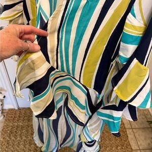 NWT Ashley Stewart long duster kimono kaftan open front cardigan coverup, ruffle waterfall front with 1 button closure, 3/4 length tiered ruffle sleeves, wavy stripe pattern, lightweight fabric. Polyester