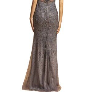 Embellished with an intricate spectacle of beadwork, this piece reveals a sheer jewel neckline on a sleeveless bodice. The back has an illusion style and a zipper closure. The mermaid skirt sparkles as it flares into a full-length finish.