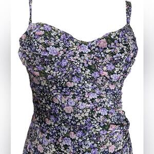 STYLE TAGS: dressy, spaghetti strap, tie strap, party, garden party, date night, summer, vacation, beach, floral, purple, pink, green, black