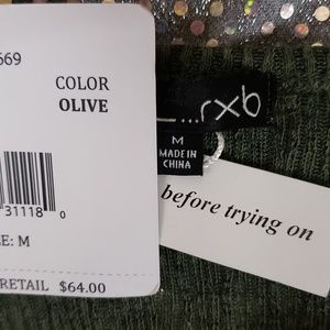 Brand new asymmetrical soft olive top. Lace overlay and ribbed waist pattern make this piece feminine and flattering. Looks great with jeans and is easy to dress up during the holidays (add red ribbon belt for a quick cute way to be festive). New with tags and as always, price is negotiable. Check out our closet for more stellar bargains. Happy Poshing and thanks for shopping. Sparkle On!
