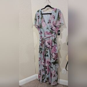 Embrace elegance with this stunning floral wrap maxi dress. Featuring a beautiful blend of light blue, pink and green hues. The flowing design and delicate pattern add a touch of sophistication to your wardrobe.