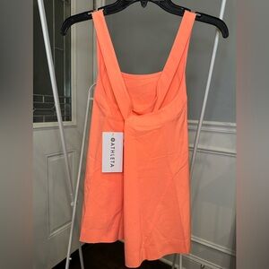 Bright pinkish-orange sleeveless top with crisscross back from Athleta. Perfect for casual outings, this vibrant tank will be a closet staple!