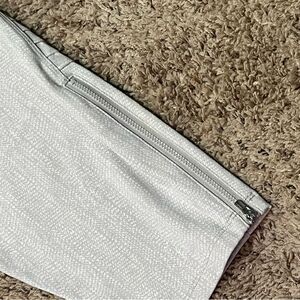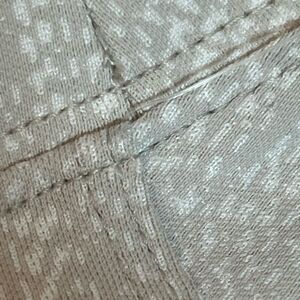 Stylish beige leggings with a textured design. Zippered rear pockets and zippers at ankles. Perfect for casual wear.
