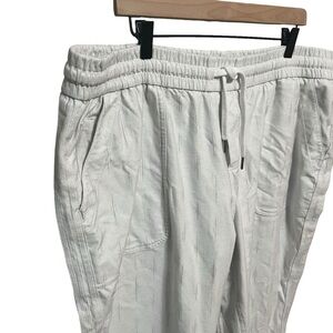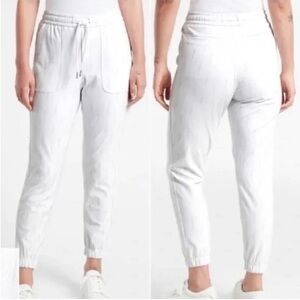 Athleta Farallon Printed Jogger in Spliced Magic Veil Grey. White and light grey print joggers. Semi-fitted. Comfort stretch. Pull on styling. open drawcord at center back waistband. Two front stash pockets. Two back pockets.
