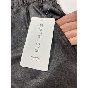 Elevate your active and casual wardrobe with these Athleta Gleam Shorts in shimmery black, featuring a leather-look stretch material for a sleek and modern look. Designed with a comfortable pull-on style, elastic waistband, relaxed fit, and convenient side pockets, these shorts offer both style and functionality.