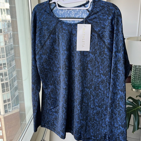 New With Tags Athleta Point Break Rashguard in fun but neutral navy blue and black print. Pullover style. 19” pit to pit. 26.5” from shoulder to hem.