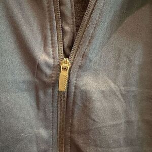 Lightweight Navy blue with black stripe Jacket. Cuffed sleeve and zipper front. 2 pockets. Polyester