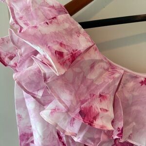 Body is lined but not the sleeve or longer portion of the dress. Has matching fabric belt. Ruffle details.