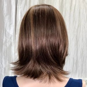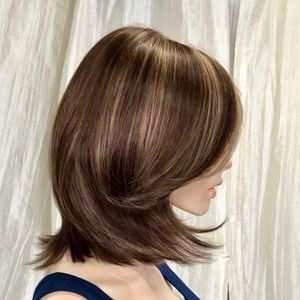 NWT Auburn Brown with Blonde Highlights Soft Page Cut Shoulder Length Wig
