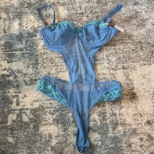 NWT Auden Mesh Lace Lingerie Bodysuit Bra Blue Thong Women's Size Small