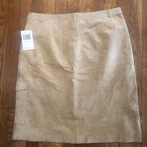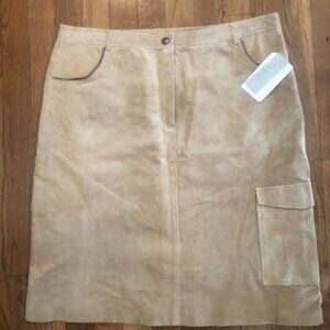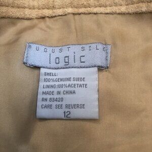 This is a women's NWT light brown sueded leather skirt with zipper accents on the front pockets from August Silk Logic, size 12. Zipper/snap closure, lined.
