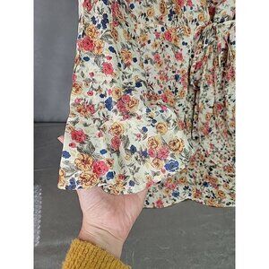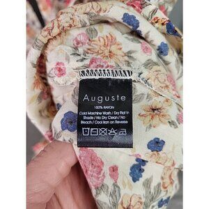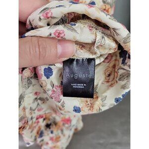This Auguste The Label wrap dress is a beautiful addition to any wardrobe. The dress features a floral pattern, long bell sleeves, and a ruffle accent. It comes in a size 10 and is perfect for a variety of occasions including travel, weddings, parties, and casual outings. The dress is designed with a bohemian theme and is perfect for those who love to add a touch of style to their wardrobe. The dress is short in length and is a mini dress that is perfect for showing off your legs.