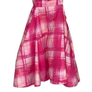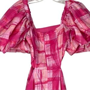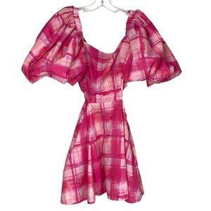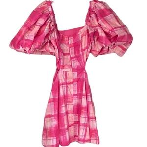 Aureta Ada Mini pink Fandango check dress with a hidden back zipper closure, exaggerated puff sleeves, pockets, and side waist cut outs. Sold on Revolve.