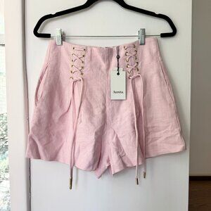 New with tags. Aureta Madeline shorts in candy pink, linen blend with tailored design, zip back, and tie-front detail, size extra small.