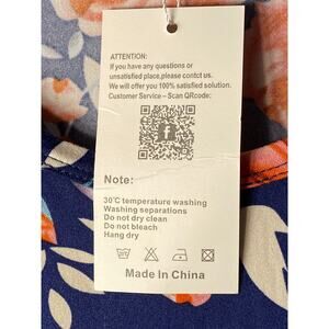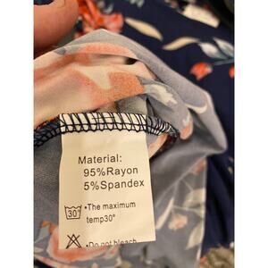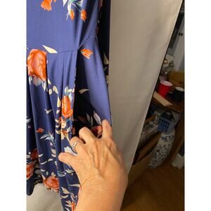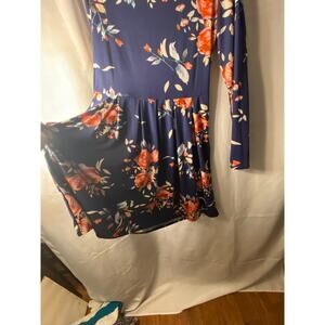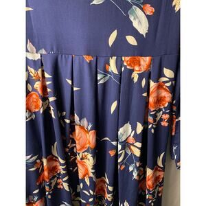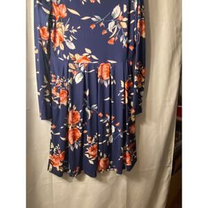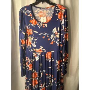 NWT Auselily Womens Size L Dark Blue w Red Roses Soft long Sleeved Pleated skirt dress. 95% rayon, 5% spandex, 16" across waist, 19" across under arms, 28" sleeves, 3" shoulder to hem.