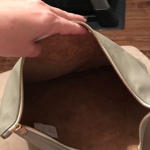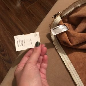 This is an authentic brand new never been used with tags American Apparel leather carryall in the largest size 19 inches x 16 inches wide x 12 inches height. Gorgeous tan/taupe color which literally matches everything!!! Zipper color and hardware are gold. Interior is camel color suede. This carryall is large enough to even fit a laptop!