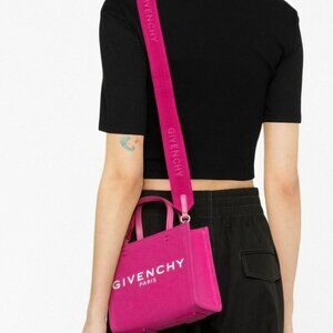 mini G canvas tote bag from Givenchy (VIP) featuring fuchsia pink, canvas, logo print to the front, internal logo patch, open top, two long top handles, adjustable detachable shoulder strap and main compartment.