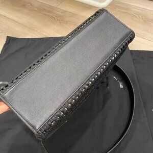 Givenchy reworks the house's signature G-Tote bag by weaving the faux-raffia into intricate lace patterns, then suspending from smooth leather handles and a detachable strap.