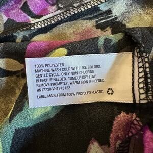 3/4 balloon Sleeve, Pullover, Elastic wrist cuffs, Lightweight fabric, Split neckline, V neckline, Relaxed fit, Black floral print, 100% Polyester.