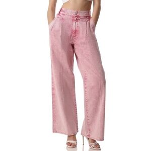 Avec Les Filles Pink Acid Wash Wide Leg Pleated Denim Trouse. High rise. Double pleated. Trouser leg. Adjustable waist strap in back. Zip fly with hook and bar closure. Hand pockets. The rear pockets opening are decorative only. There are no rear pocket bags. 100% cotton no-stretch denim. Machine wash cold with like colors. Tumble dry low. I have more than one pair of these pants. The acid wash finish on the pants you receive may be different from that shown in the photos here.