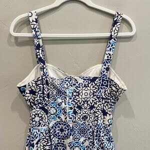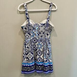 Avec Les Filles Sweetheart Neck Stretch Cotton Mini Sundress in Barcelona Tile Blue