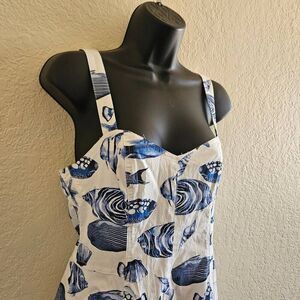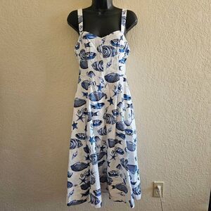 Set sail in style with this charming Marina Midi Dress by Avec Les Filles. Featuring a whimsical nautical print with blue sea creatures including tropical fish, starfish, and seashells on a crisp white background, this dress is perfect for summer outings, beach vacations, or casual daytime events. This dress has a sweetheart neckline with wide shoulder straps for a flattering fit, and a fit-and-flare midi style.