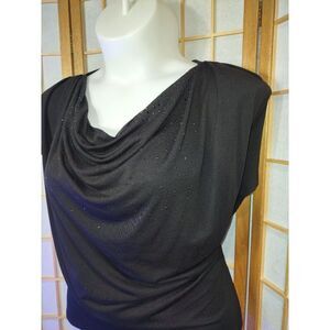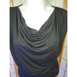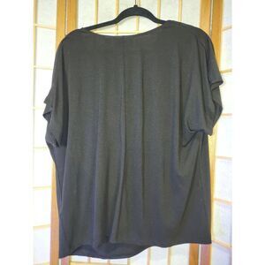 Gorgeous, classic top from the Avenue. New with tags. Size 18/20. Black with black rhinestone accents. Flowing, draped design for slimming effect. 78% polyester, 19% rayon, 3% spandex. Machine washable. Made in China. Excellent condition. Nonsmoking home.