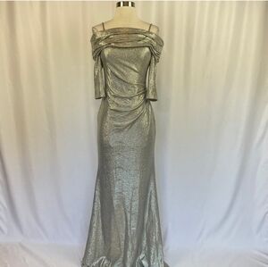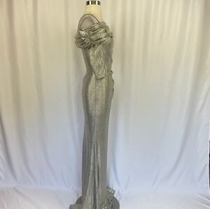 4. shimmering metallic gown is accented with long sleeves and of-the-shoulder styling in this one-of-a kind evening gown by Avery G.
