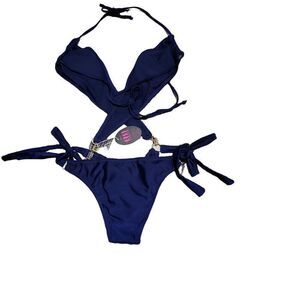 Sexy monokini swimsuit features gold tone chain hardware details. Cheeky butt coverage. Fully lined cups.