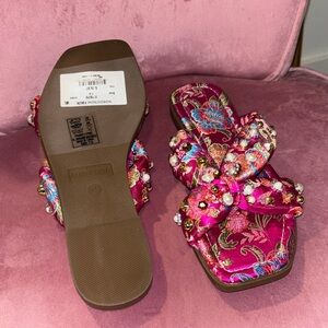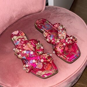 Step out in style with these vibrant pink sandals, featuring intricate floral designs and elegant embellishments. Perfect for adding a pop of color to any outfit.