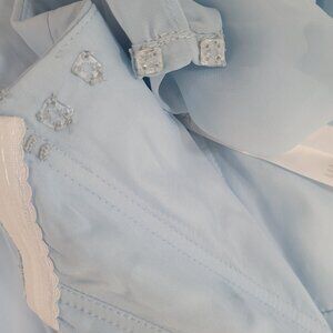The NWT Azazie Sky Blue Empire Waist Chiffon Side Slit Bridesmaid Dress is a stunning and elegant option for weddings or formal events. This long A-Line dress features a sweetheart neckline, short removable flutter sleeves, and a chiffon fabric that adds a touch of sophistication. The custom size C dress is perfect for those looking for a solid blue color with a side slit detail, making it a versatile and classic choice for any season. The dress is made from polyester and requires dry cleaning for care, ensuring easy maintenance for the special occasion.